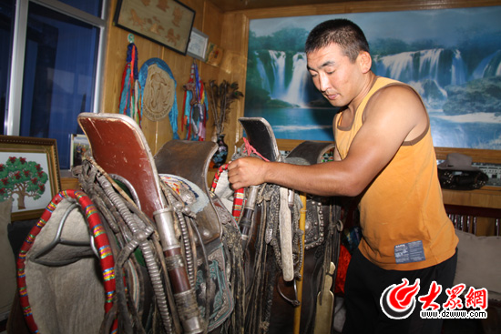 小兒子達(dá)萊在擺置父親和哥哥扎木蘇的兩幅馬鞍,上面的配件都是純銀打造。