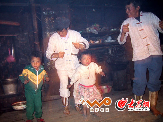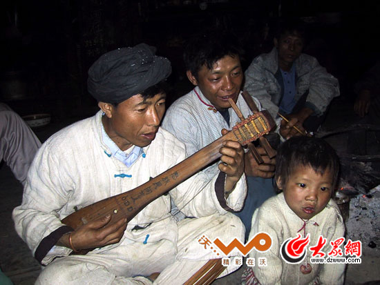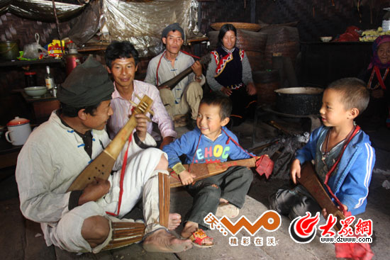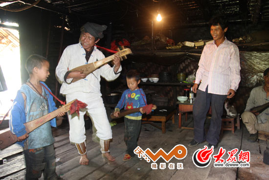 大眾網(wǎng)-聯(lián)通3G怒江10月21日訊(特派記者 王磊)8日下午,從貢山縣丙中洛結(jié)束獨(dú)龍族的采訪后,“黨旗漫卷中國紅——走進(jìn)56個(gè)民族家庭”采訪團(tuán)來到福貢縣架究村回訪怒族省級(jí)民間藝人歐得得。十年前,怒族民間藝人“歐得得”曾擔(dān)心自己將會(huì)是怒族最后一位能彈達(dá)底達(dá)變(怒族一種傳統(tǒng)四弦樂器)的歐得得;十年后,當(dāng)包益四再次為采訪團(tuán)彈奏歐得得時(shí),他身旁多了一位伴舞的小歐得得,這個(gè)孩子名叫石江源,他是包益四的孫子,也是歐得得未來的希望。