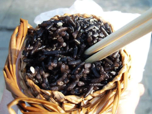為農(nóng)歷三月三食用。烏米飯的制法,是用山上的一種野生植物烏稔樹(shù)(杜鵑科,烏飯樹(shù))的葉子,放到石臼舂碎后,貯到布袋里,連袋放到鐵鑊里,加適量的水熬湯,讓它釋出紫黑色的湯汁來(lái),而后去掉袋里葉渣,將精選的糯米泡進(jìn)湯進(jìn)汁里,幾小時(shí)后,撈起放到木甑里蒸熟即成。烏米飯色澤烏黑發(fā)藍(lán),香軟可口。由于烏稔能起開(kāi)脾、防腐作用。故將烏米飯放在通風(fēng)陰涼處,數(shù)日不腐。食用烏米飯有準(zhǔn)備春耕,迎接豐收的象征意義。
