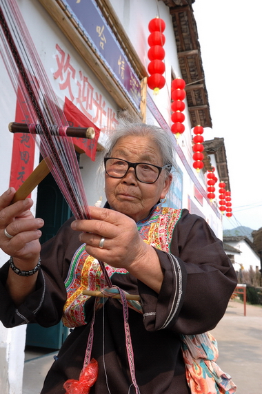 畬族姑娘長到六、七歲時,母親就教授她織彩帶。彩帶以絲線編織為主,也有用棉紗或苧麻編織的?棽蕩]有特制的織帶機,屋內(nèi)屋外乃至山野都可編織。若在屋內(nèi)編織,就把 絲線的一端拴在凳腳、桌檔或屋柱上,另一端系在自己的腰間,坐 在凳上編織。要是在山野編織,可把絲線的一端拴在小樹桿或樹樁上,另—端仍束在腰身,坐在地上或跪在地上編織。