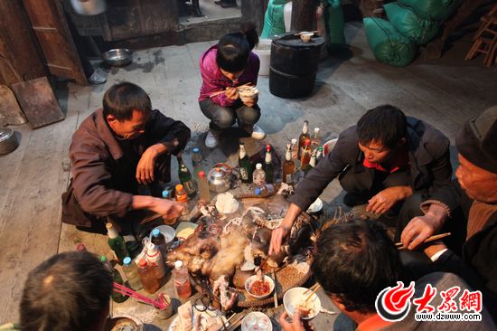 韋桃花回到三洞鄉(xiāng)板龍村的老家里的老宅,為祈求平安發(fā)財(cái)請(qǐng)水書(shū)先生做法事。祭祀用的小香豬在儀式結(jié)束后成為前來(lái)幫忙的親朋鄉(xiāng)鄰的腹中美味