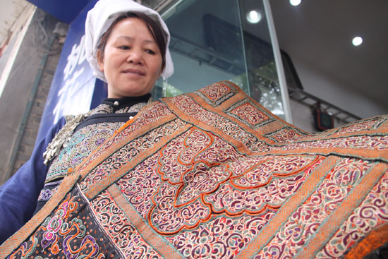 韋桃花向記者展示一幅有一兩百年歷史的馬尾繡背帶,隨歷經(jīng)歲月,但鮮艷依舊