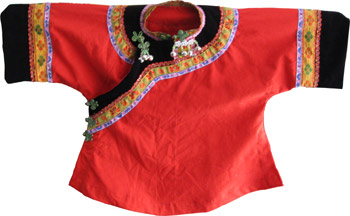 水族女服多以水家布縫制,無領(lǐng)大襟半長衫或長衫。長衫過膝,一般不繡花邊。而節(jié)日和婚嫁盛裝與平時截然不同。婚禮服上裝的肩部一圈及袖口,褲子膝彎處皆鑲有刺繡花帶,包頭巾上也有色彩繽紛的圖案。頭戴銀冠,頸戴銀項圈,腕戴銀手鐲,胸佩銀雅領(lǐng),耳垂銀耳環(huán),腳穿繡花鞋。新娘子往往被打扮的花枝招展,風采翩翩。此外婦女刺繡的背帶更有藝術(shù)性。說是"帶",實際上是一塊刺繡華麗的"T "形"簾子",上端兩邊有帶,"簾子"的大小可包住幼兒。它是將白色馬尾纏繞上白絲線,再加上其它彩色絲線,先把各種圖案分別刺繡好,最后將繡好的圖案拼鑲到背帶布料上做成的。背帶美觀實用,是母親對出嫁女兒最好的禮品。