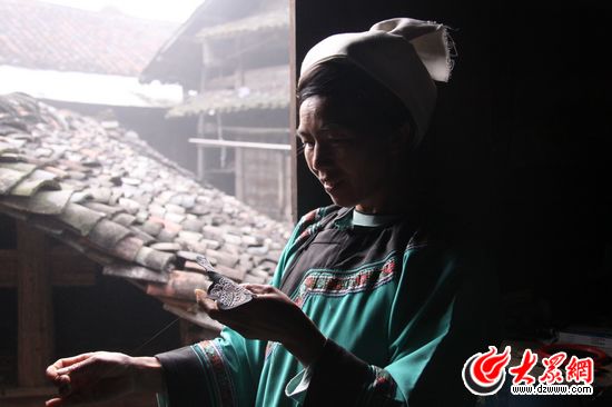 水族女子在繡制馬尾繡。她們抽空就繡幾針,不計工時費,因此繡品價格相對較低