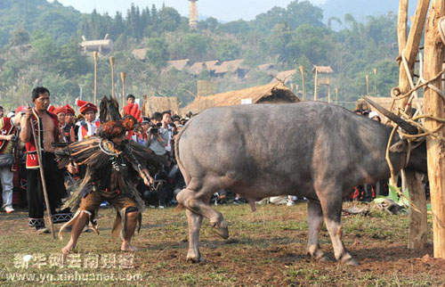 傳說(shuō)中,人類的圣母“媽儂”去世后(在今西盟縣岳宋鄉(xiāng)曼亨丫口),其子安木拐為了紀(jì)念她對(duì)人類的貢獻(xiàn),為她舉行了隆重的追悼會(huì)。其中有一項(xiàng)內(nèi)容是安木拐與水牛之間的比賽。安木拐與水牛相互請(qǐng)對(duì)方提出比賽條件。最后,由水牛先提出比賽條件。水牛愚蠢地認(rèn)為在平路上容易拉屎,爬山不容易拉。水牛對(duì)安木拐提出:爬山比賽,看誰(shuí)先累得拉出屎來(lái),誰(shuí)就為失敗者。當(dāng)剛爬到半山腰時(shí),水牛的屎就嘩啦啦地掉下來(lái),水牛失敗了。在集會(huì)的總結(jié)上,水牛與人類(安木拐)結(jié)為好友,水牛把自己作為豐厚的禮物全部獻(xiàn)給了人類(安木拐),從此人類(安木拐)可以任意宰殺水牛并作為食物,但是水牛還有一個(gè)條件,就是水牛的頭必須作為供品珍藏起來(lái)。人類(安木拐)的子孫后代為了紀(jì)念和發(fā)揚(yáng)她的豐功偉績(jī),就把水牛作為最珍貴的物品贈(zèng)給了她。