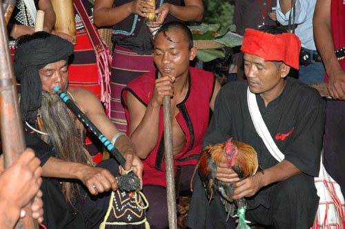 木鼓是佤族的象征,是佤族人民崇拜的神圣之物。他們認(rèn)為,木鼓是 “通神之器”、“通天之鼓”, “生命靠水,興旺靠木鼓”。因此,平時(shí)不能亂動(dòng),只有祭祀報(bào)警和節(jié)日喜慶等重大集體活動(dòng)時(shí)才能敲打。由于木鼓的這種神圣地位與作用,“拉木鼓”便成為佤族極為隆重、盛大的宗教祭祀活動(dòng)。