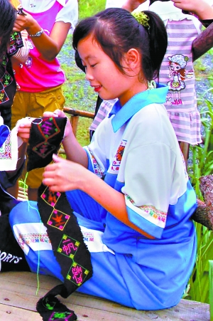 這些獨具特色的民間技藝帶有濃郁的瑤族色彩,融文化、娛樂、傳說、互動、競技于一身,一下子就贏得了幾乎所有孩子的喜愛。老師說,最受孩子們歡迎的課程是反面繡、高腳競技等。每到上課時間,孩子們便早早地守候在上課場地周圍伸長著脖子等著老師來傳授這些好玩的“絕技”。