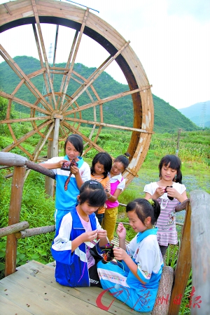 幾名瑤族少女,圍坐在緩緩轉(zhuǎn)動著的巨大水車旁,幾雙巧手飛針走線,一絲彩線靈活地在粗糙的織布上下穿刺,一個精美的吉祥圖案漸漸躍然布上。孩子們使用的刺繡技法,和中國幾乎所有刺繡方式都不同,那是在大山深處流傳有千年之久的神秘“過山瑤反面刺繡”。為了讓這一瀕臨失傳的古老藝術(shù)奇葩能夠后繼有人,乳源瑤族自治縣目前正在該縣專門接收少數(shù)民族學(xué)生就讀的學(xué)校中展開一場大規(guī)模的普及傳統(tǒng)民間技藝的教育。至上月止,累計4000多名瑤族少女掌握了“反面繡”的基本技法,其中佼佼者的作品,還作為珍貴禮品贈送給外賓。