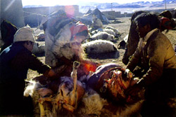 藏族宰殺牲畜的方式有些特別。也許是受宗教影響,他們忌諱用刀宰殺牛羊,而是用繩索將牛羊嘴巴牢牢捆住,使其無法呼吸而死。牧人們一般選擇膘肥、年老的公畜,以及長期不懷胎、經(jīng)常流產(chǎn)或產(chǎn)仔成活率低下的母畜宰殺。當然屠宰數(shù)量是有規(guī)定的,一是根據(jù)全家冬季甚至全年食用所需;二是取決于農(nóng)牧產(chǎn)品交易的數(shù)量;三是依草場的承載能力而定。