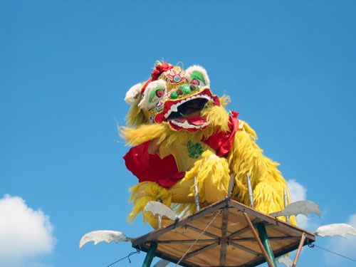 表演時(shí),舞獅者攀上由20多張高凳疊起的“金山”施展雄姿,時(shí)而在半空高懸的鋼索繩上跳躍翻騰,時(shí)而在刀山頂上表揚(yáng)稱“世界一絕”的刀尖頂肚旋轉(zhuǎn)……一個(gè)個(gè)高難度動(dòng)作令人贊嘆不已!疤靿ニ、“三獅戲樓臺(tái)”、“女子樓臺(tái)獻(xiàn)藝”、“高樁、天橋薈萃”、“瑞獅爭(zhēng)艷”等幾個(gè)精彩的節(jié)目,也吸引著眾多游客的注意。