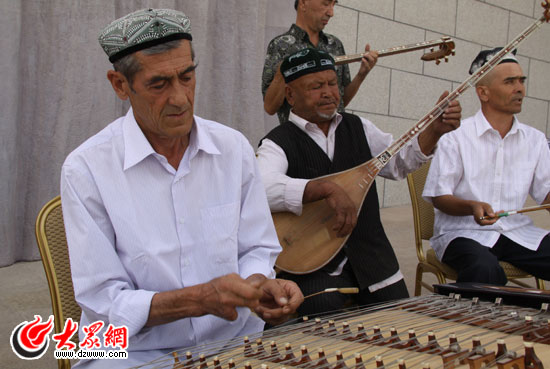 3日上午,在樓蘭博物館旁“樓蘭美女”的巨幅浮雕下,由若羌宣傳部、文化局特意為我們召集的10位若羌民間藝人共同彈唱一段傳統(tǒng)的《若羌賽乃姆》。八旬老藝人、《若羌賽乃姆》非遺傳承人哈斯木·玉素甫老人彈起冬不拉先以一段木卡姆獨唱開場,在一段粗獷渾厚低婉的歌聲后,曲調的節(jié)奏開始加快,同時,盤子(類似古箏的樂器)、羌(類似二胡小提琴的樂器)和手鼓等多種樂器一起演奏,樂隊所有彈奏著開始齊聲合唱,這后面的合唱才是《賽乃姆》,在輕快的旋律中,民間藝人們將動人的愛情故事、豐收的歡樂及人民英勇無畏的堅強精神逐一歌頌。
