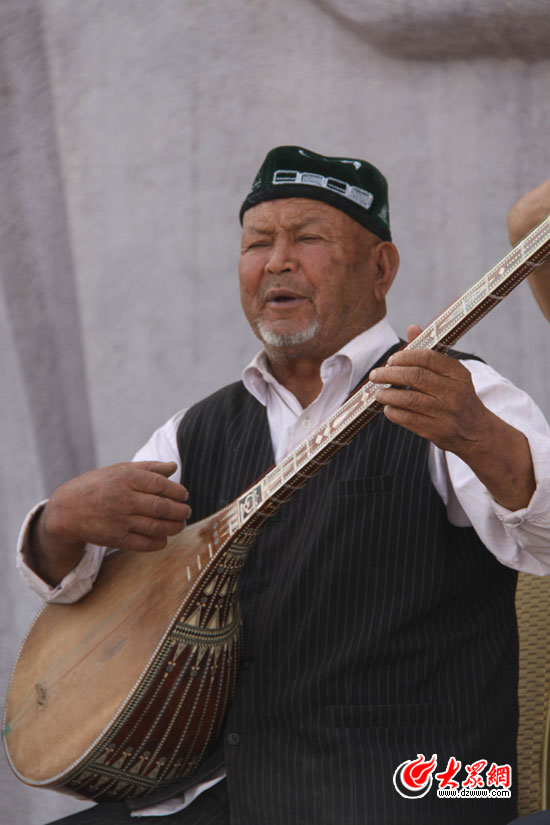 一位頭戴氈帽的維族老人彈奏著東不拉(類似琵琶的樂器)