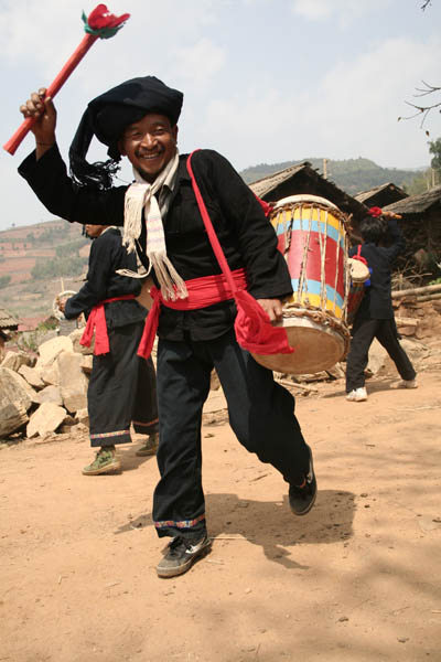 每個(gè)民族都是能歌善舞的民族,我們不例外。我們布朗族的舞蹈是全民性的,白發(fā)老者、少年兒童只要聞聽(tīng)竹笛響,便會(huì)翩翩起舞。而年輕人特別喜歡跳“圓圈舞”。先由能歌善舞的小伙子領(lǐng)舞,伴隨著铓鑼、象腳鼓的節(jié)奏,姑娘們、小伙子們圍成一個(gè)圓圈,雙膝微微起伏。柔軟的雙手在肩兩側(cè)或前或后輕盈翻舞,邊舞邊向反時(shí)針?lè)较蛞苿?dòng)腳步。同時(shí),一群小伙子在圈內(nèi)有節(jié)奏的作虎步跳躍。時(shí)而分散到姑娘面前與姑娘輕聲對(duì)歌,時(shí)而又聚攏,作虎跳狀。如此循環(huán)反復(fù),盡情抒發(fā)心中的喜悅。