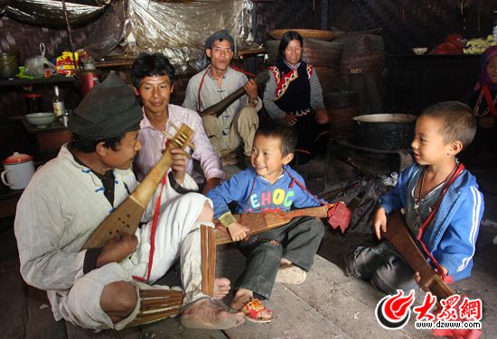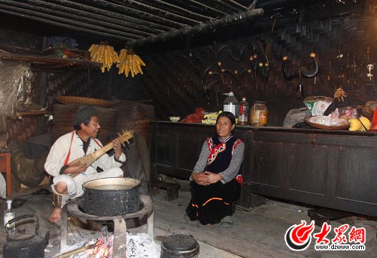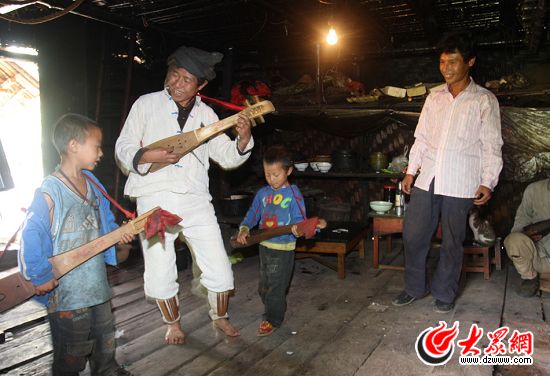 怒族舞蹈中的達(dá)比亞舞是以一種形似琵琶的彈撥樂(lè)器作為伴奏,歐得得就是伴奏者,他善于彈唱,能給大家?guī)?lái)歡樂(lè)。歐得得家在山上,茅草頂,草席墻,日常的生活必需品都需要到山下購(gòu)買,然后用竹筐背上山。房子是竹木結(jié)構(gòu),屋內(nèi)的裝飾也很簡(jiǎn)單,墻上掛著的幾支野羊角,羊角上的蛋殼,墻邊的木柜,歐得得的生活簡(jiǎn)單而質(zhì)樸。歐得得正在彈奏的樂(lè)器叫達(dá)底達(dá)變,是祖輩們傳下來(lái)的四弦樂(lè)器,彈奏的位置多變,姿態(tài)豐富,可以高彈低彈,上彈下彈,反彈正彈。在表現(xiàn)形式上,由歐得得的伴奏的達(dá)比亞舞分為單人、雙人、集體等多種形式。這是歐得得正和他的妻子一起表演怒族的情歌對(duì)唱。歐得得會(huì)六十余種歌舞,他的舞步節(jié)奏穩(wěn)健,以膝關(guān)節(jié)帶韌性的屈伸顫動(dòng)為主,再加上腳的動(dòng)作,讓他練就了一雙鐵腳板,門口處的木地板就是歐得得家永不閉幕的舞臺(tái)。他希望有更多的人了解達(dá)底達(dá)變,好讓這古老的舞蹈?jìng)鞒邢氯ァ?/P>
