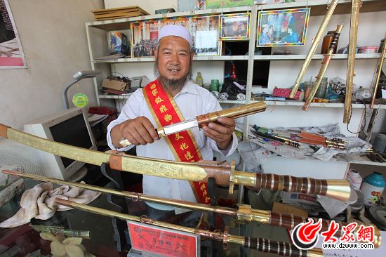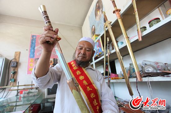 保安族腰刀“國(guó)家級(jí)項(xiàng)目傳承人”馬維雄展示他打制出來(lái)的刀。