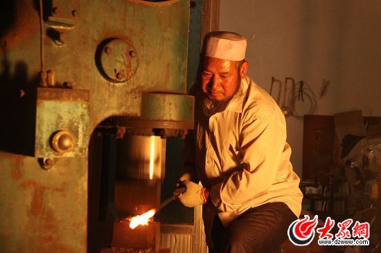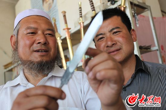 保安族腰刀“國(guó)家級(jí)項(xiàng)目傳承人”馬維雄向記者展示剛剛打制出來(lái)的佩刀。