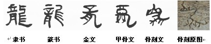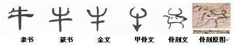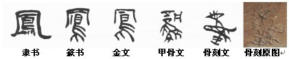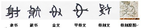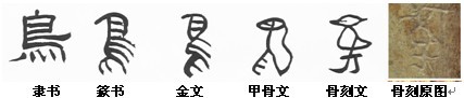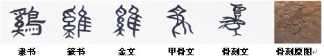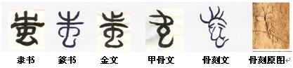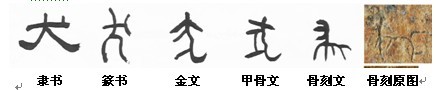 筆者認為,根據(jù)甲骨文向金文演變的某些規(guī)律,對于東夷骨刻文的破譯是非常有必要借鑒的。甲骨文向金文的過渡有幾種情況,一是從具有很強的圖畫性到脫離圖畫的符號化的演變;一是由繁到簡的演變;再就是完全照搬,筆畫相同,有的只是在書寫方法上略有變化。當然也有少量是由簡到繁的,這往往是形聲字演變的結果,有的增加了形旁或聲旁,但基本上是萬變不離其宗,有規(guī)律可循的。而東夷骨刻文向甲骨文的演變也基本上存在這四種情況,只不過由圖畫性向符號化過渡更為明顯,由象形、指事、會意向形聲字轉變的還不多見。由于借鑒了這一規(guī)律,在劉教授破譯的八個字的基礎上,筆者一口氣又破譯了近百字。為了便于對照辨認,按照漢字發(fā)展和演變的順序,對這些破譯出的文字分別用骨刻文、甲骨文、金文、小篆和隸書的書體,以書法藝術的表現(xiàn)形式創(chuàng)作了幾幅題為“中國文字演變過程”的書法藝術作品,并在每字后附有骨刻原圖,今取其一,以供讀者參考鑒別。(如圖)