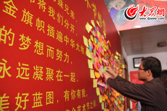 山東黃金集團藝術節(jié)暢想展板前,員工在將自己的暢想小貼紙粘貼在展板上,組成一個“心”