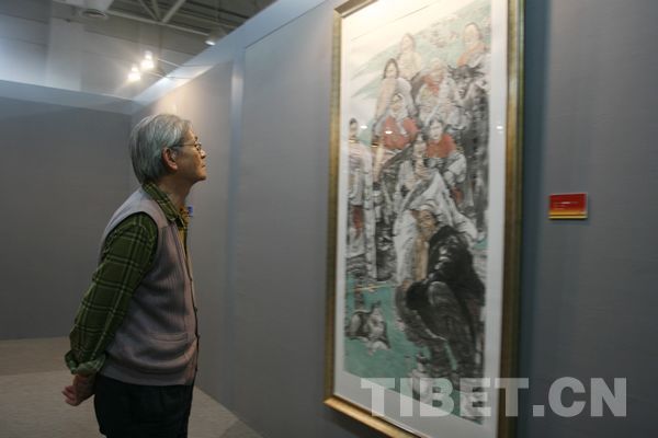 [提要] 有句話說:“一千個人眼里有一千個哈姆雷特”,其實,對于熱愛西藏、向往西藏的人來說又何嘗不是如此呢!薄 ∏窭蠣斪涌串嫹浅UJ(rèn)真,只見他一幅幅作品挨著看過去,每走到一幅畫前都仔細(xì)端詳,時不時跟記者分享他的感受。