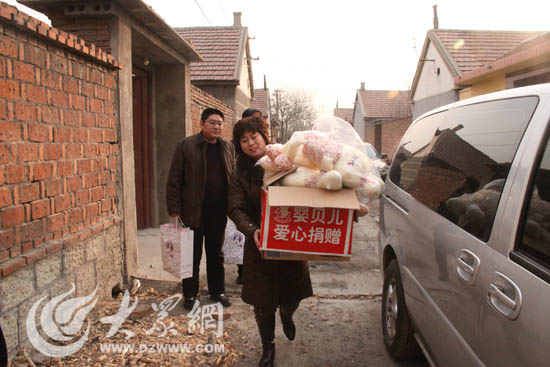 大眾幫幫團(tuán)帶著愛心捐贈的禮物來到平度馬戈莊村看望三胞胎姐妹(大眾網(wǎng)記者 隋喬 攝)