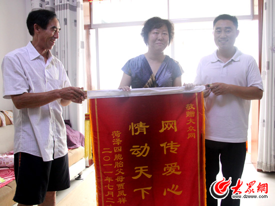 賈鳳祥把印有“網(wǎng)傳愛心 情動(dòng)天下”的錦旗送到大眾網(wǎng)總編助理、采訪中心主任李冉手中。