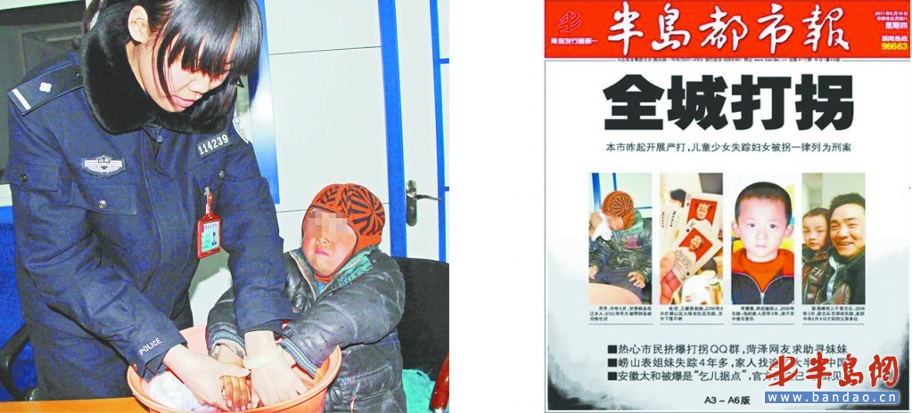 ▲ 島城警方在幫乞討兒童洗手洗臉 。( 資料圖片) ▲本報(bào)曾多次關(guān)注乞討兒童。
