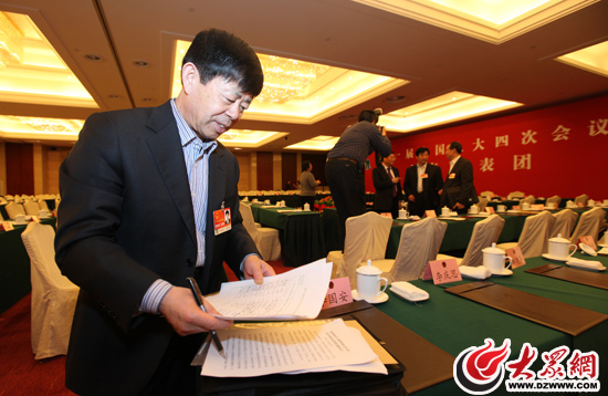 全國人大代表、山東省青島喜盈門集團(tuán)董事長紀(jì)玉君在討論會后認(rèn)真整理議案和建議。(特派記者 曹亮 攝)