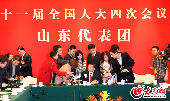 今天下午,十一屆全國人大四次會議山東團對中外媒體開放,吸引了75家中外媒體參加,在現(xiàn)場,記者們紛紛舉起“長槍短炮”,姜大明省長成為現(xiàn)場提問的焦點。大眾網(wǎng)記者抓住為數(shù)不多的機會,向姜省長提問:“姜省長,您在去年全國兩會的時候回答了大眾網(wǎng)友的十個問題,今年一如既往地關(guān)注大眾網(wǎng)友,繼續(xù)回答了網(wǎng)友的提問,您如何看待現(xiàn)在網(wǎng)友通過網(wǎng)絡(luò)進行問政的現(xiàn)象?你認為政府面對網(wǎng)絡(luò)問政應(yīng)該采取什么樣的態(tài)度?”