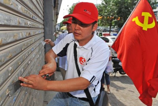 6月28日,黨員志愿者服務(wù)隊在街頭清除小廣告。 “七一”前夕,寧夏開展黨員志愿者服務(wù)行動,組織機關(guān)、企事業(yè)單位黨員到街頭開展志愿服務(wù)工作。 新華社記者 王鵬攝
