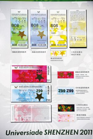 為防止偽造門票,大運會門票采用了多重防偽技術,包括OVI光變油墨、液晶光變油墨、三色熒光油墨等印刷防偽技術及DMC動態(tài)模式識別數(shù)字防偽技術。市民可以通過一看二摸三測試來檢驗真?zhèn)危阂豢,門票上的星星圖案,不同角度會變化不同色澤,同時門票采用珠光片防偽紙張,背面可見熒光色澤的亮片;二摸,門票上的星星圖案,用手一摸,不是光滑的,而是具有粗糙感;三測試,使用普通驗鈔機,可見大運會門票背面正中有3個“U”形的歡樂圖案。