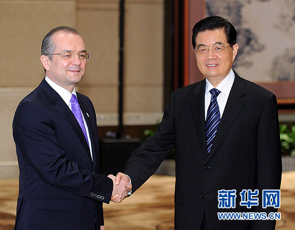 國家主席胡錦濤12日在廣東省深圳市會見了來華訪問并出席第26屆世界大學生運動會開幕式的羅馬尼亞總理博克。