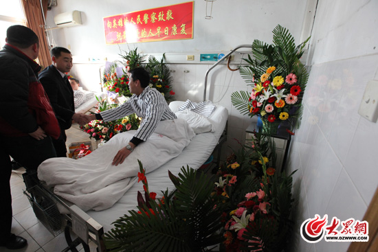 今天上午9時(shí),大眾網(wǎng)記者來到解放軍88醫(yī)院,與光榮負(fù)傷的趙偉、劉峰兩位民警進(jìn)行短暫的交流。記者注意到,兩位民警的病房里擺滿了同事和市民送來的鮮花,病房的墻上貼著“向英雄的人民警察致敬,祝最可愛的人早日康復(fù)”紅底黃字標(biāo)語格外醒目。兩位受傷民警情緒穩(wěn)定,傷勢恢復(fù)較好。