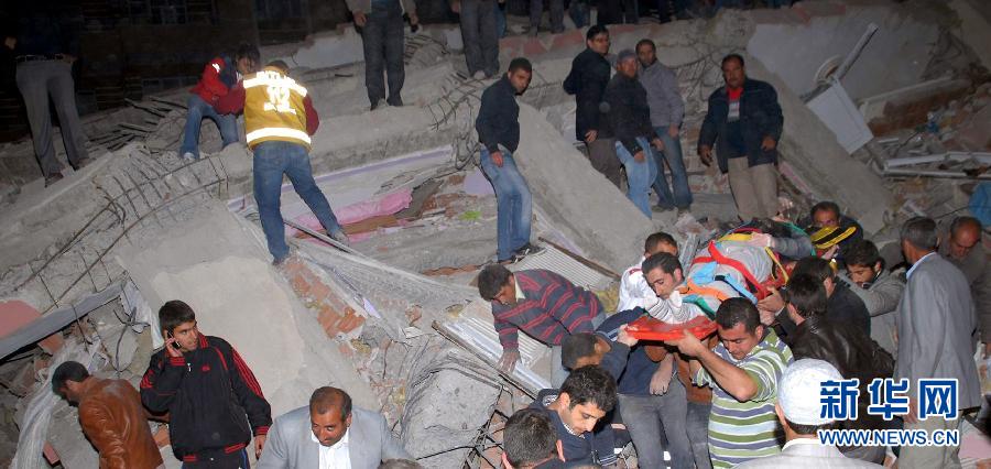 10月23日,在土耳其東部凡省地震災區(qū),當?shù)鼐用駨膹U墟中救出一名傷員。土耳其總理埃爾多安23日說,到目前為止,土耳其東部凡省發(fā)生的強烈地震已經(jīng)造成138人死亡、350人受傷。新華社/阿納多盧通訊社