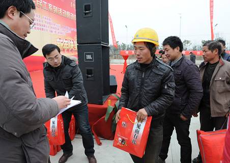 現(xiàn)場向農(nóng)民工送慰問品