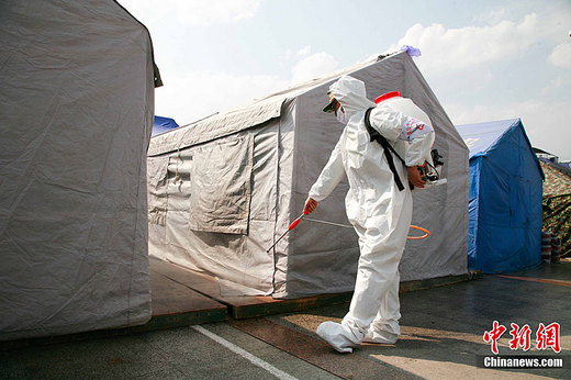 資料圖:云南盈江地震發(fā)生后,云南公安邊防部隊(duì)迅速投入災(zāi)區(qū)救援工作。圖為3月12日,正在進(jìn)行消毒防疫的公安邊防醫(yī)院醫(yī)生。中新社發(fā) 劉冉陽 攝