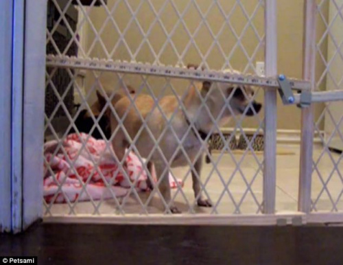 就在吉娃娃好不容易把頭和一只前腳伸出去時,它的后半截身子卡在門縫中間,動彈不得。吉娃娃發(fā)狂似的扭動身體,把整扇門給晃了下來。這時,它的兩個同伴跑了出去,不顧仍卡在門中間的吉娃娃。無奈之下,可憐的吉娃娃靠自己的力量把已經(jīng)伸出去的部分身體給“拔出來”,最終也獲得了“自由”。