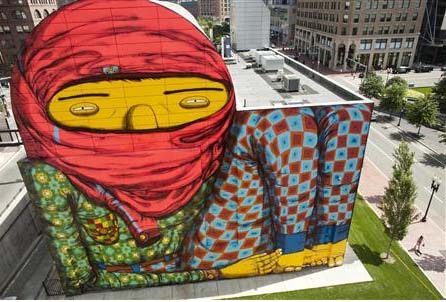國際在線專稿:據(jù)英國路透社8月8日?qǐng)?bào)道,在位于美國波士頓的杜威廣場(Dewey Square)的公園里近日出現(xiàn)了一幅面積為441平方米(長21米,寬21米)的巨型壁畫。這幅由巴西雙胞兄弟奧塔維奧(Otavio)和古斯塔夫?潘多爾夫(Gustafo Pandolfo)共同創(chuàng)作,描繪了一位衣著鮮艷但色彩并不搭配、面部被紅色圍巾遮住只露出雙眼的人蜷腿半躺在地上。這幅圖引發(fā)了當(dāng)?shù)厥忻駸嶙h。