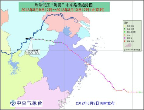 由于“海葵”強度已明顯減弱,中央氣象臺9日18時解除臺風藍色預警。