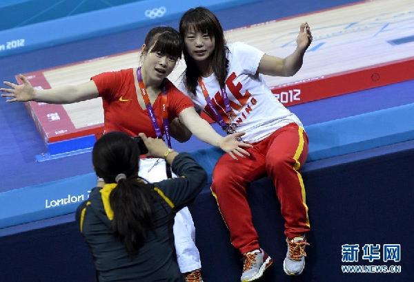 7月30日,王明娟(左)在舉重場地拍照留念。在7月28日的倫敦奧運(yùn)會(huì)女子舉重48公斤級(jí)決賽中,中國選手王明娟以205公斤的總成績奪得金牌。新華社記者公磊攝