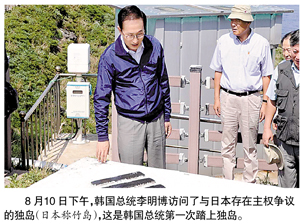 韓國總統(tǒng)李明博10日下午訪問了韓國與日本存在主權爭議的獨島(日本稱竹島),成為首位登上獨島的韓國國家元首。領土紛爭使韓日關系再掀波瀾。日本外相玄葉光一郎當天緊急召見韓國駐日大使,并召回日本駐韓國大使,以示強烈抗議。