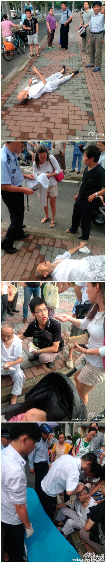微博稱,圍觀群眾打120得到的回答卻是無車無法調(diào)配,無人敢上前扶起老人。上述外籍人士用自己的白絨巾墊在老人頭下,看著地上的血痛哭,還拿出錢給身邊的圍觀者,說幫忙交上醫(yī)藥費(fèi)。過了半個(gè)小時(shí)左右,救護(hù)車才趕來將老人送到了附近的455醫(yī)院。