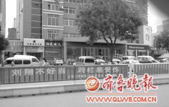 寫(xiě)有“劉翔不好當(dāng),跨欄易受傷”宣傳語(yǔ)的條幅掛于海陽(yáng)市海陽(yáng)路的一處護(hù)欄上。圖片由市民邢志新提供。