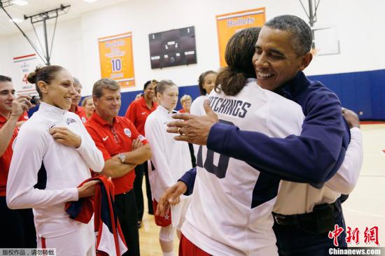 當(dāng)?shù)貢r(shí)間2012年7月16日,美國(guó)華盛頓,美國(guó)總統(tǒng)奧巴馬觀看了美國(guó)女籃和巴西隊(duì)的表演賽,賽后奧巴馬接見(jiàn)美國(guó)女籃隊(duì)員。