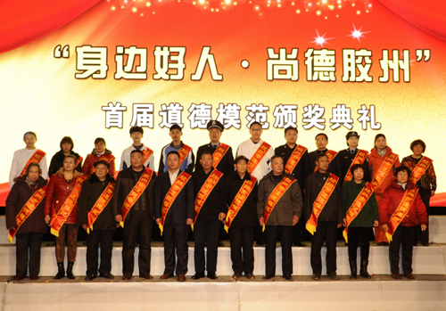 2013年2月4日,“身邊好人?尚德膠州”首屆道德模范頒獎(jiǎng)典禮在膠州市人民會(huì)堂舉行。青島市委常委、宣傳部長(zhǎng)胡紹軍,膠州市現(xiàn)任副市級(jí)以上領(lǐng)導(dǎo)出席并參加了頒獎(jiǎng)典禮。