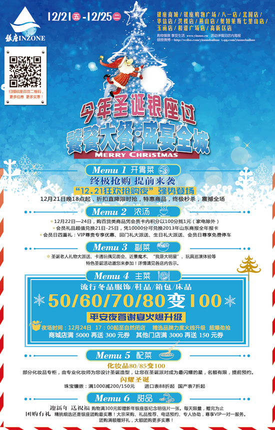 副菜   圣誕老人禮物大派送、卡通玩偶見面會(huì)、近景魔術(shù)、“我是大明星”、玩具巡演體驗(yàn)等特色圣誕活動(dòng)邀您來參加!詳情請見各店內(nèi)告示。