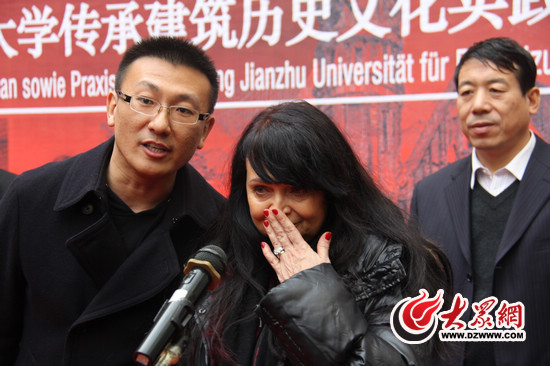 今天上午,濟(jì)南老火車站設(shè)計(jì)者的孫女西維亞夫婦來(lái)到山東建筑大學(xué)圖書館,參加“菲舍爾與濟(jì)南老火車站暨山東建筑大學(xué)傳承建筑歷史文化實(shí)踐”圖片展。在發(fā)言最后,當(dāng)西維亞用漢語(yǔ)說(shuō)出“謝謝”時(shí),她被現(xiàn)場(chǎng)觀眾的熱情感動(dòng)得再次落淚。