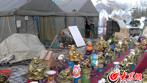 生意不好,幾個(gè)人就坐在“臥室”里嗑瓜子閑聊。說(shuō)是臥室,其實(shí)就是綠色帆布搭建起來(lái)的簡(jiǎn)易帳篷,里面墊上磚塊,磚塊上面再鋪上木板就成了床。王明說(shuō),在這里,取暖基本靠“擠”。“在家千日好,出門(mén)一日難,沒(méi)出過(guò)門(mén)是想不到有多苦,慢慢習(xí)慣了,心態(tài)好了,就沒(méi)事了。”
