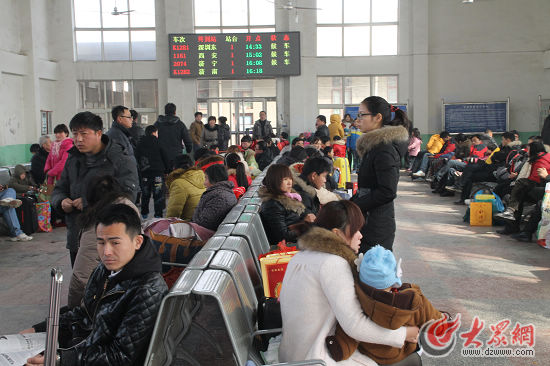 2月12日是大年初三,離農(nóng)民工、上班族返崗還有一段時間,但記者在巨野站的候車廳發(fā)現(xiàn)乘客卻很多,一般是兩三個人中帶著個兒童,像是一家人乘車出行!10幾年前,往往是大的節(jié)假日固定幾天忙碌,但現(xiàn)在人口流動性逐漸增強,不分什么初一、十五的,每天出行的人都很多,像今天初三外出的,大都是走親訪友!崩铎o說。