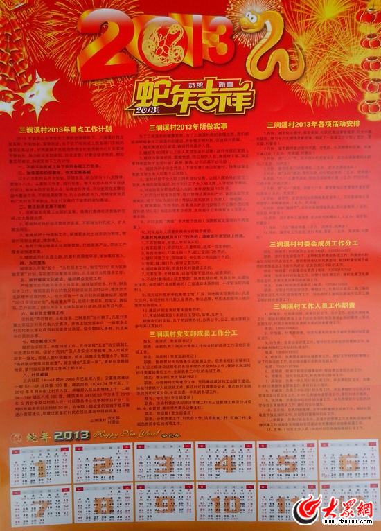 三澗溪村2013年新年掛歷印著該村2013年重點工作計劃等內(nèi)容。