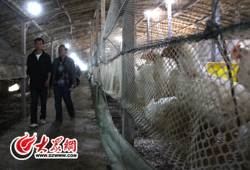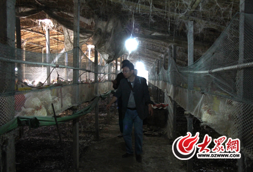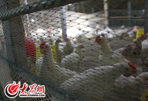 在李富來的帶領(lǐng)下記者鉆進(jìn)了他家的雞棚,棚里的燈光很暗,雞欄里的雞如今都已經(jīng)長成,雖然棚里的通風(fēng)措施做得不錯,但是濃烈的雞糞味還是熏得人直頭疼,可能是因為到了喂食的時間,看到有人進(jìn)來棚里的雞就一起咕咕的叫了起來。